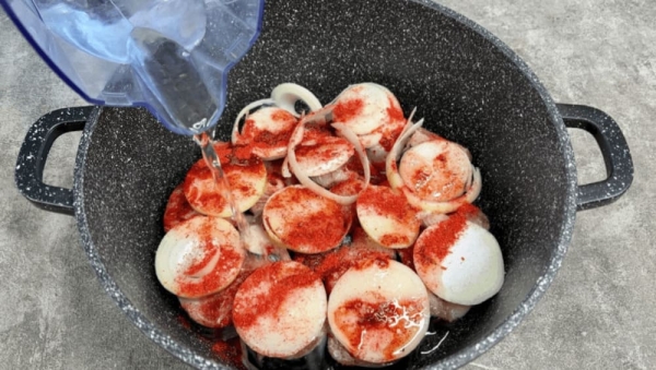 Накройте всё крышкой. Отправьте кастрюлю на огонь. Доведите ее содержимое до кипения. Проварите всё в течение 7 минут.Уберите кастрюлю с плиты. Остудите ее содержимое до комнатной температуры. Затем отправьте рыбку с луком, накрытые крышкой, на 2 часа в холодильник.