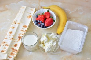 Для приготовления сладкой шаурмы подготовьте необходимые ингредиенты. Фрукты и ягоды можно взять любые по своему вкусу.