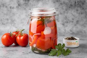 Заполните банку помидорами, а в пустые места положите ломтиками болгарского перца. Сверху выложите еще колечки красного лука и петрушку.