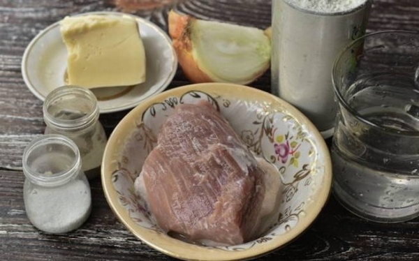 Шаг 1. Сразу подготовьте все продукты, которые вам понадобятся для начинки. Свинину берите с небольшой жировой прослойкой, чтобы чебуреки вышли более сочными. Нарежьте мясо кубиками.