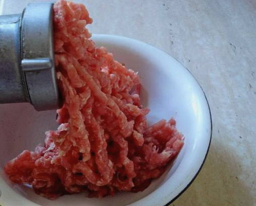 Шаг 6. Вместо телятины вы можете взять любое другое мясо, которое вам больше нравится. Нарежьте мясо кубиками и прокрутите через мясорубку.