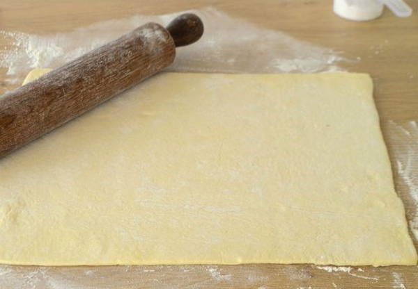 Шаг 1. Вскройте упаковку с готовым слоеным тестом и разморозьте его при комнатной температуре. Немного раскатайте тесто скалкой и нарежьте полосками.