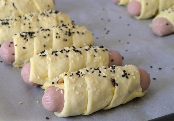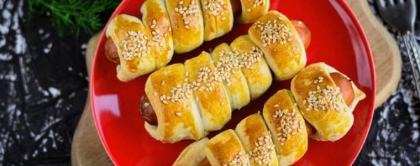 Сосиски в дрожжевом слоеном тесте с кунжутом