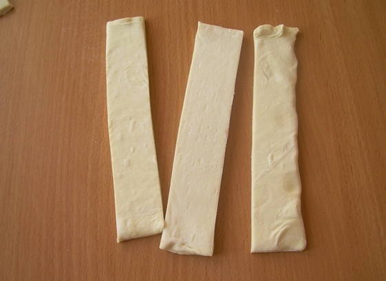 Шаг 2. Тесто разрежьте на полоски шириной 1-1,5 сантиметра, длиной 17-18 сантиметров.