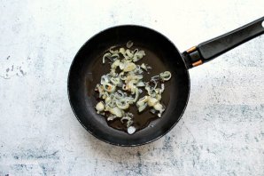 В сковороду налейте растительное масло, выложите сливочное масло, разогрейте на среднем огне. Репчатый лук очистите, порежьте и обжаривайте в течение трех минут. Переложите в миску.