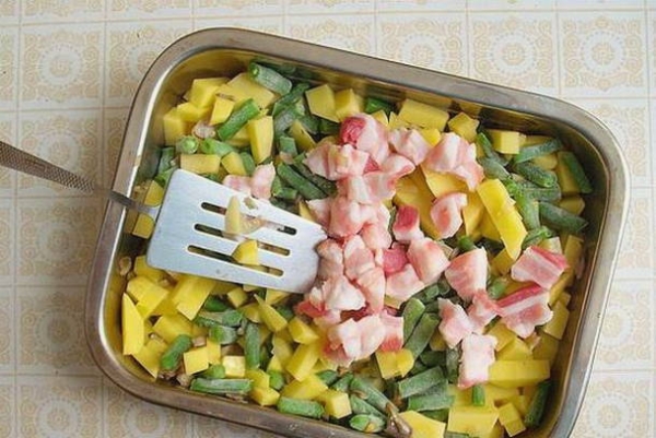 Шаг 4. В жаропрочную форму выложите пассерованный лук и грибы, далее положите картошку и фасоль. Сверху разложите ребра, кусочки сала и мяса.