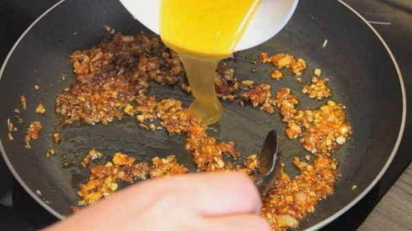 Шаг 6. Обжарьте на растительном масле оставшийся лук и чеснок, добавьте смесь специй.