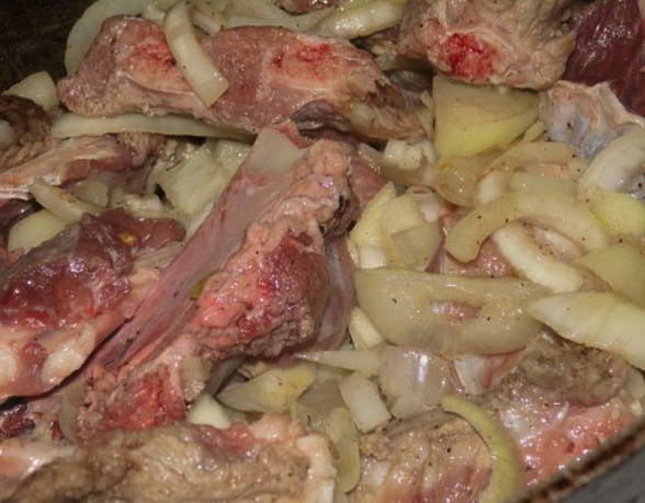 Шаг 7. Убавьте огонь под казаном, жарьте ребра и лук до тех пор, пока последний не станет мягким и прозрачным.