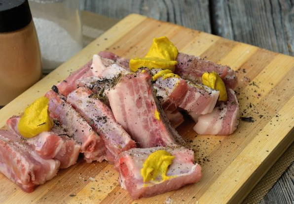 Шаг 2. Ребрышки помойте, затем промокните от жидкости бумажными полотенцами. Порубите их на порции по мягкой прослойке между ребер. Поперчите и приправьте ребрышки специями, добавьте пару чайных ложек горчицы и перемешайте их руками.
