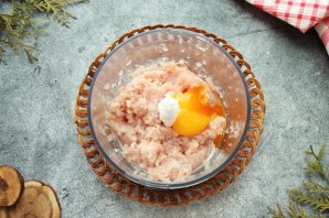 Белки взбейте миксером до пышной, плотной пены и добавьте в фарш. Аккуратно перемешивая сверху вниз, перемешайте до нежной массы.