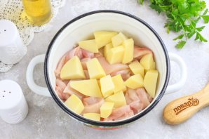 Промойте филе, нарежьте его порционными кусочками. Нарежьте очищенный картофель средними кубиками и высыпьте все нарезки в кастрюлю или казан.