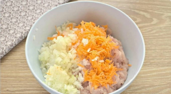 Шаг 3. В миске соединяем фарш, морковь, рис и вымешиваем.
