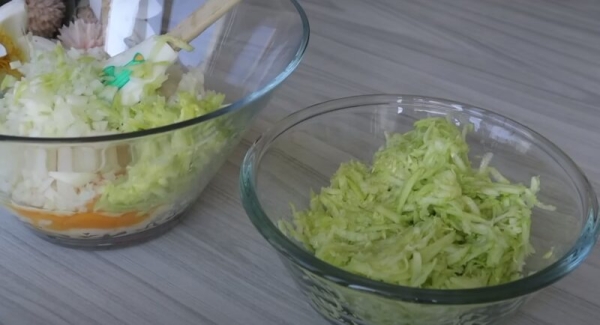 Удаляем у цукини плодоножки и кожуру, натираем на крупной терке. Нарезаем маленьким кубиком репчатый лук. В рис разбиваем яйца, выкладываем лук и отжатую от лишней жидкости кабачковую массу.