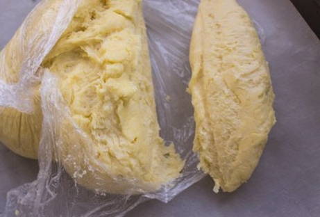 Тесто скатать в шар, сплюснуть рукой, завернуть в пищевую пленку и положить в морозильную камеру на 30 мин. Это делается для того, чтобы тесто быстрее и равномернее охладилось, и чтобы с ним было легко работать.