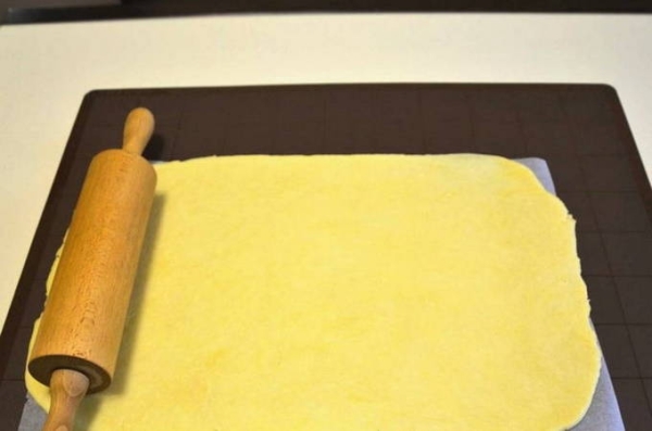 7. Равномерно разложить прокрученное тесто по противню, застеленному пергаментом для выпечки. Духовку поставить разогреваться до 180 градусов. Выпекать печенье около 20 минут до золотистого цвета.