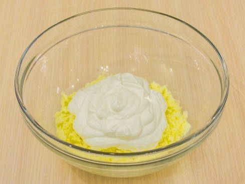 3. Выложить к продуктам жирную сметану и размешать до однородности.