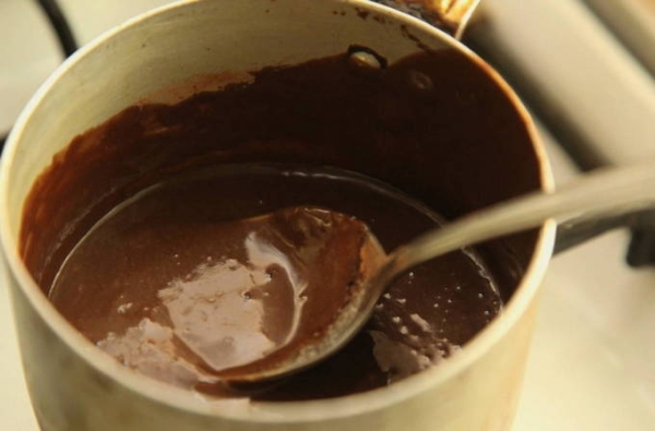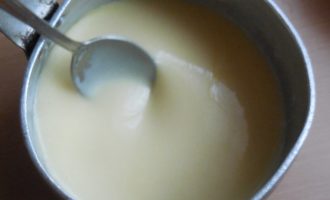10. В сотейнике растопить сливочное масло, добавить туда же вареную сгущенку и продолжать нагревать.