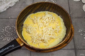 Сковороду нагрейте с 1 столовой ложкой масла, вылейте омлетную массу и сверху разложите натертый сыр. Готовьте под крышкой 4-5 минут при небольшом нагреве до готовности. Омлет переворачивать не нужно. Как полностью схватится сверху переложите на блюдо.