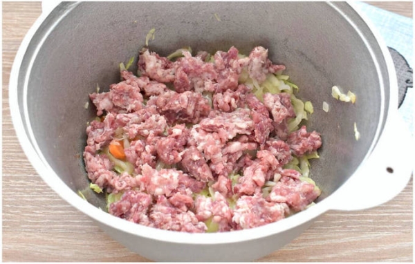 Шаг 3. Выкладываем к овощам мясной фарш. При желании, можно использовать кусочки мяса.