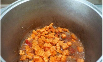 Шаг 4. Очищаем и режем средними кубиками картофель. Выкладываем его в общую массу. Пару минут обжариваем и вливаем воду. Кипятим и затем тушим на слабом огне до мягкости картофеля.