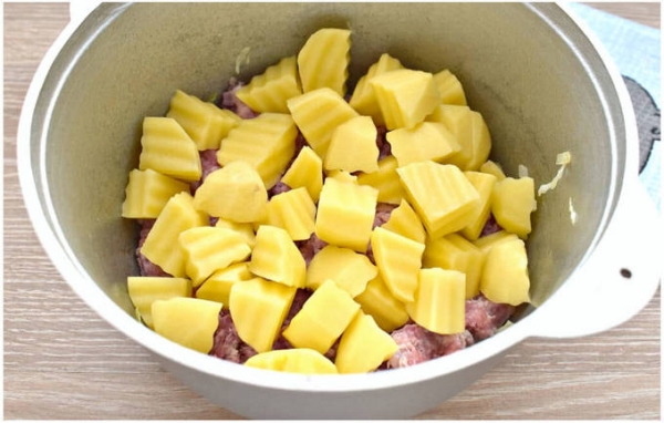 Шаг 6. Сюда же отправляем кусочки очищенного картофеля.