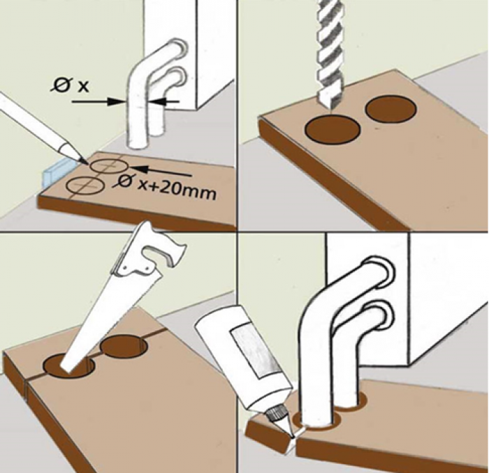 6. В некоторых местах пола потребуется ламинатом обойти выпущенные из стяжки вертикальные трубы отопления. Для этого на панели высверливают коронками по дереву отверстия на 5-8 мм шире, чем труба отопления. После этого на панели выполняют поперечный ровный распил прямо по центру просверленного отверстия. Ламинат укладывают по месту его монтажа, а отпиленный кусочек панели приклеивают к ее торцу «суперклеем» или клеем «титан».