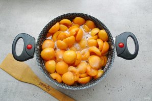 После поставьте на плиту, доведите абрикосы в сиропе до кипения, огонь убавьте и варите 10-15 минут.