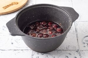 Переложите черешню в сахарном сиропе в кастрюлю с толстым дном. Доведите до кипения и на медленном огне варите 20 минут.