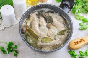 Как только жидкость закипит, удалите образовавшуюся пену шумовкой. Кстати, бульон после варки шей можно использовать при приготовлении других блюд или просто подать к столу с сухариками.