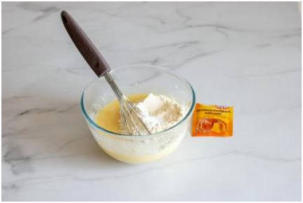 Шаг 4. Затем в сметано-яичную смесь высыпать муку с разрыхлителем и замесить тесто до однородной текстуры. Тесто оставить на 15 минут, чтобы начал действовать разрыхлитель.