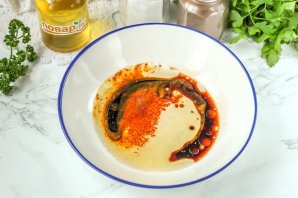 В глубокой емкости смешайте все заявленные специи и пряности, соевый соус и растительное масло без аромата.