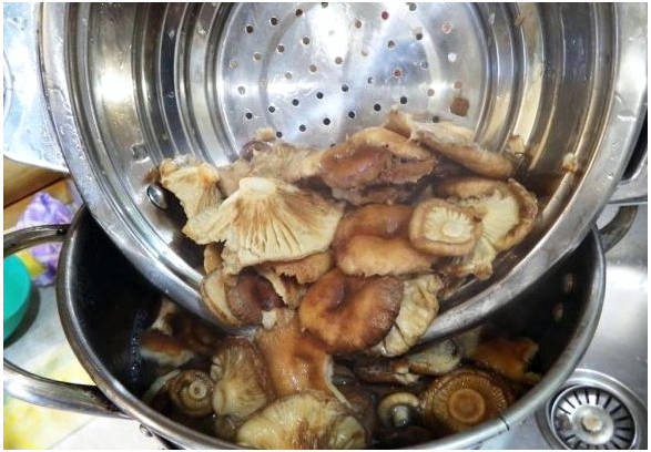 Шаг 2. После волнушки промываем и отвариваем 20 минут после закипания. Отбрасываем на дуршлаг. Стерилизуем банки и кипятим крышки.