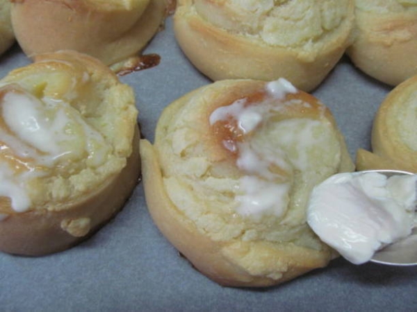 Шаг 11. После выпекания обмазываем поверхность булочек сметаной и оставляем их на 10 минут в покое без духовки.