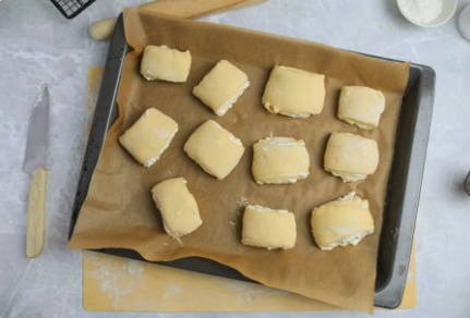 Шаг 9. Заготовки выкладываем разрезом вниз на противень с пергаментом.