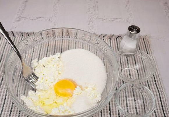 Шаг 2. В глубокую миску выкладываем творог, два вида сахара, яйцо и соль.