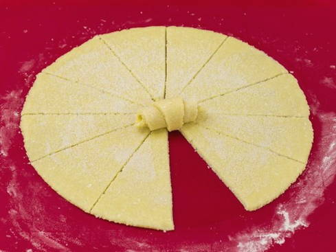 Шаг 8. Тесто с творогом сворачиваем в плотный рулет, после его разделяем на части.