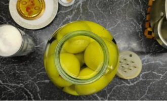 Заливаем плоды крутым кипятком, прикрываем крышками и оставляем в таком виде на полчаса.