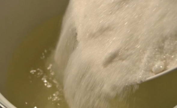 Сливаем воду в кастрюлю. Дополняем сахаром, нагреваем и постоянно помешиваем до растворения сухого ингредиента.
