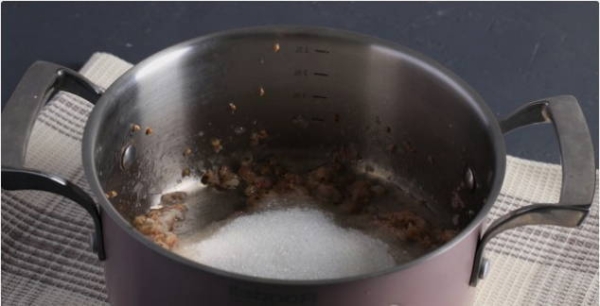 Шаг 5. После, в кастрюлю насыпаем сахарный песок и переливаем жидкость из банки.