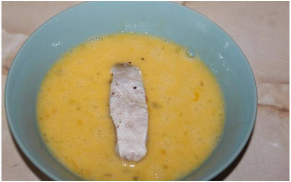 Шаг 3. Взбиваем куриные яйца. Погружаем сюда рыбные кусочки.
